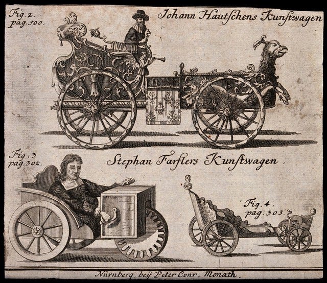 One of the earliest self-propelled vehicles was created by Hans Hautsch, a German inventor, in 1649. Hautsch's car worked with a system of springs wound by a key, similar to modern wind-up toys. It could move about 2,000 paces (around 1.6 kilometers) in an hour.