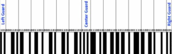The first line reflects none of the light (or very less light) - Hence assigned the digit 1. The next line reflects almost all light - hence assigned 0. In the same manner, all columns are assigned the numbers. Total assignations - 95. Note that these numbers are different from the one actually put below. After this, these 95 numbers are grouped into 15 different sections. 12 of these sections are used for the actual visible numbers and the remaining 3 act as guards - Left Guard, Center Guard and Right Guard. You can see that in each bar code the left, the right and the center sections are similar.