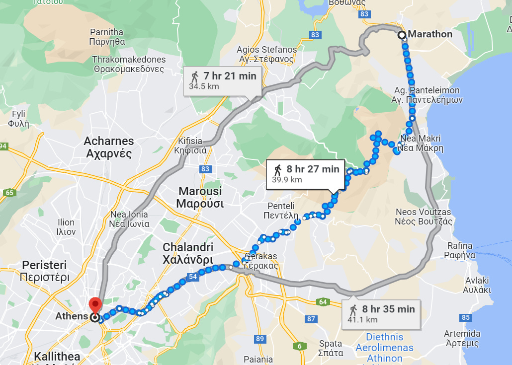 The distance from Marathon to Athens is ~40 km and so is the length of an actual Marathon race (42.195 km). (Check the image from Google maps, above)